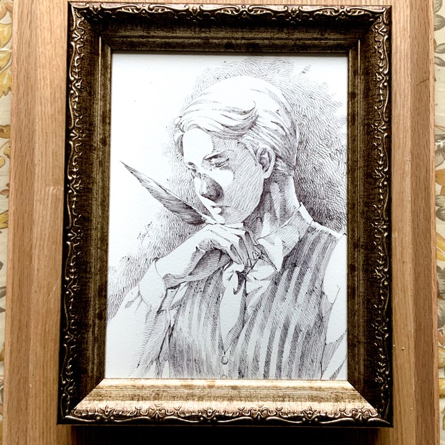 「旦那さまの羽ペン」2021年 ボールペン・ウォーターフォード紙 作品サイズ:100×100mm 額サイズ:200×200mm 飾り方:裏面ひも付き(壁掛けフックは別売り) 貴族の館 書斎にて 羽ペンとインク壺 シンプルだか美しい意匠 職人の手によるものだろう 俺が使う量産品とは大違いの代物だ 一瞬手が出て引っ込めた 天壌 Instagram:https://www.instagram.com/tenjoumeg/ Twitter:https://twitter.com/tenjoumeg