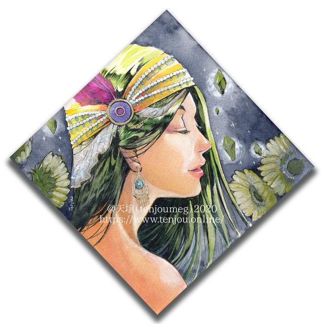 「8月のペリドット」 水彩・ペン・ウォーターフォード紙・木製パネル 作品サイズ:180mm×180mm 飾り方:裏面ひも付き(壁掛けフックは別売り) 8月の誕生石。 ペリドットは夫婦の幸福 ・和合の意味が込められています。 そして添えられている花は誕生花のひまわり。 小さなひまわりには「愛慕」「高貴」の意味があります。 和を尊ぶペリドットには上品な笑顔が似合います。 2020年の作品を加筆しました。 ミニ缶ケース https://tenjou.booth.pm/items/3477964